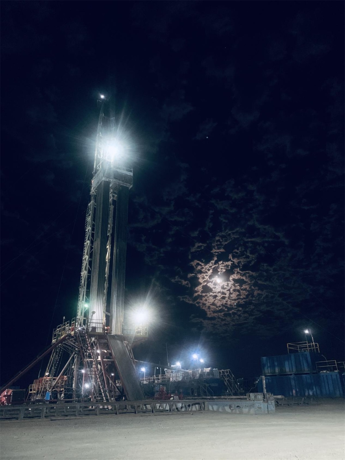 一座座“發光”的鉆塔,猶如一個個出現在眼前鋼鐵巨人,他們屹立在隔壁、沙漠,夜空中,鉆塔頂端閃爍的燈光,轟隆隆的機械聲,施工井場在夜色的襯托下顯得沸騰又繁忙。夜晚更是絢麗多彩,井架上的彩燈像繁星一樣,點綴著夜空,給正通施工現場增添了迷人的色彩。